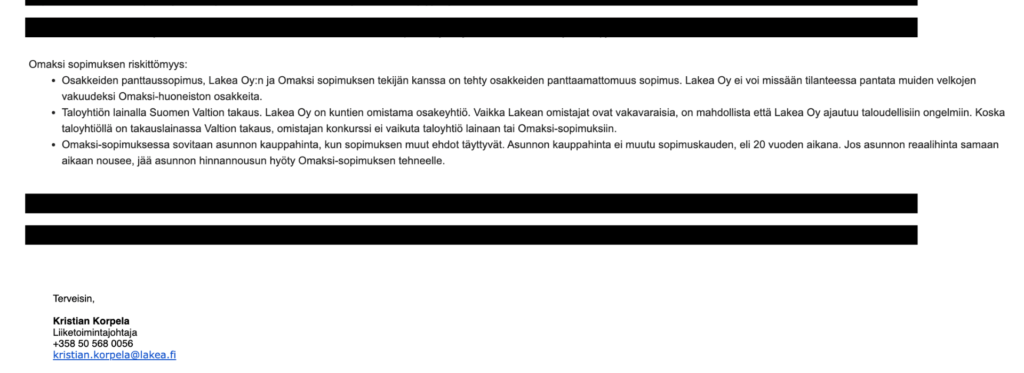 Lakean entisen liiketoimintajohtaja Kristian Korpelan mukaan konkurssi ei vaikuta taloyhtiön lainaan tai Omaksi-sopimuksiin.