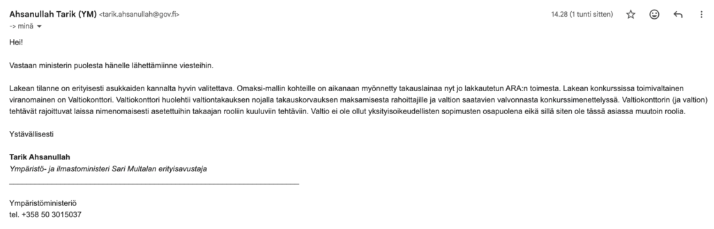 En löytänyt vastausta edes alkuperäiseen kysymykseen, joten lähetin ministerille pyynnön selventää muutamaa kohtaa. Ministerin erityisavustaja vastasi, mutta ei kysymyksiini. Vai onko niin, että valtiokonttori vastaa nykyään kysymyksiin, koskien ympäristöministerin vastausta?